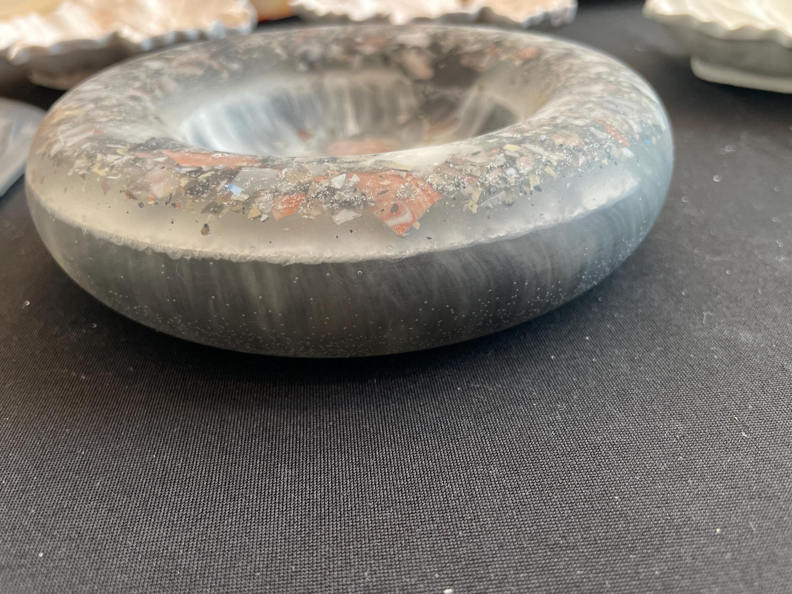 handcrafted gypsum circular trinket bowl, black with multi color chips